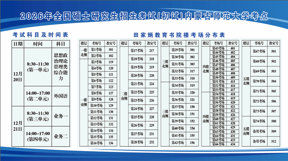 12月20日一12月21日赛罕校区餐厅一楼及二楼的东、西厅为考生全天开放: